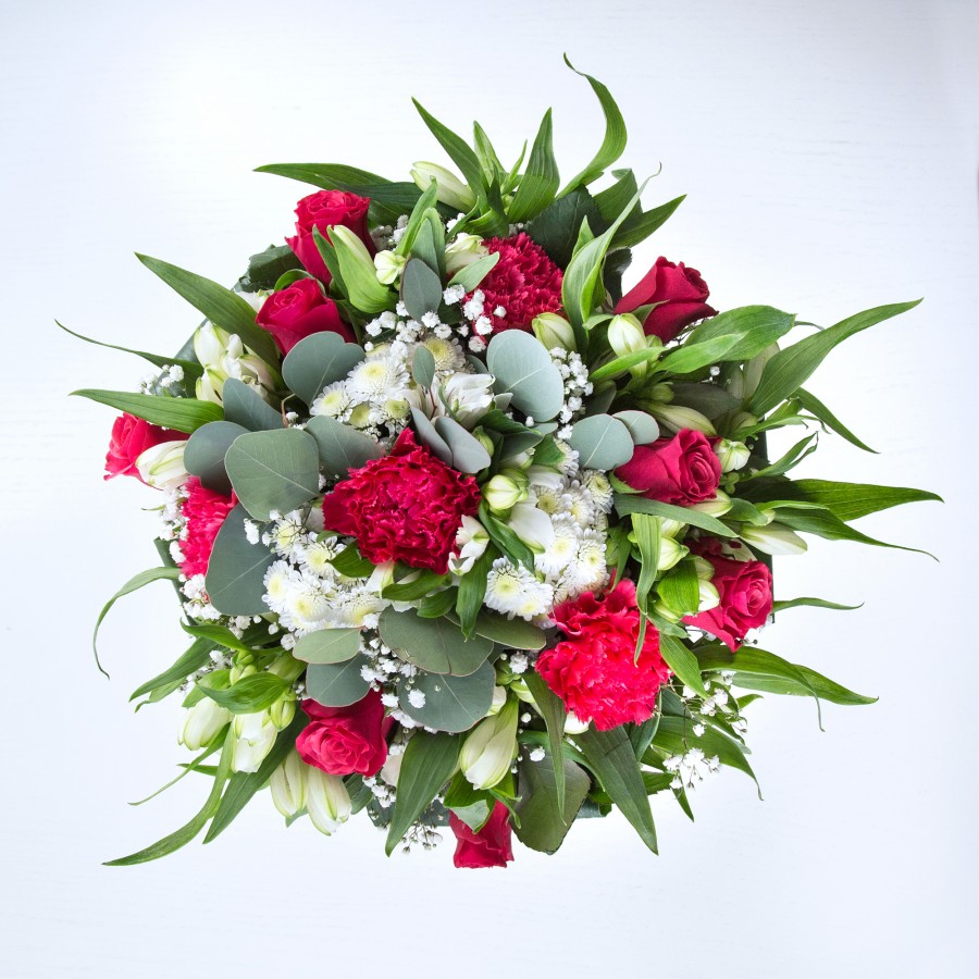 Our elegant red and white ensemble features a harmonious mix of red roses, white chrysanthemums, and gypsophila. Enhanced with carnations, white alstroemeria, and aspidistra leaves, this bouquet offers a unique and sophisticated floral display.